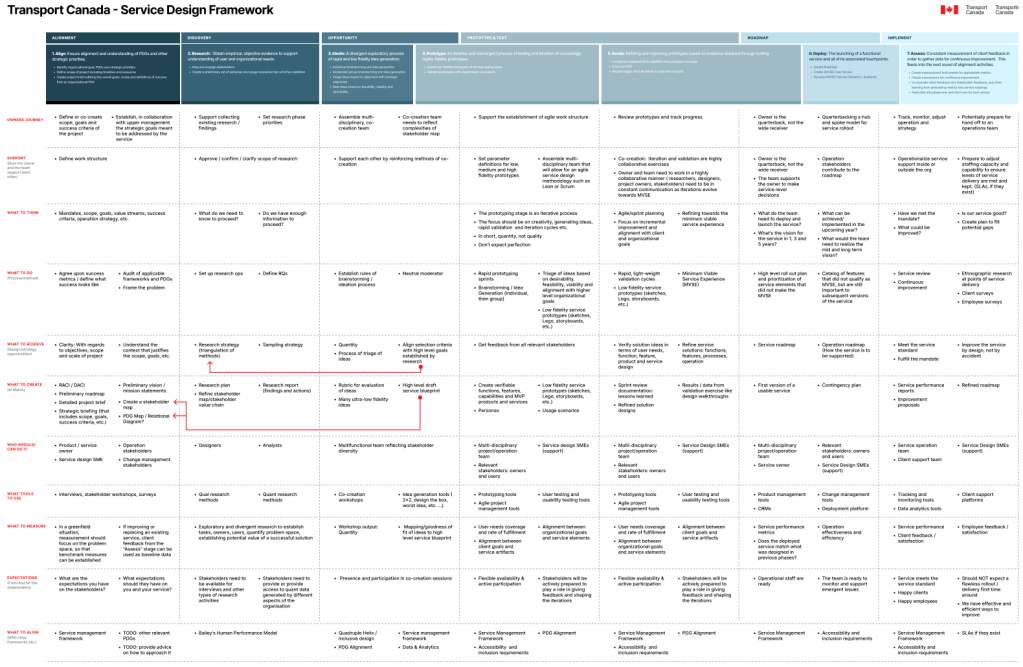 - Service Design Framework. I co-developed a comprehensive departmental framework implementing government policy on service and digital transformation. This standardized toolkit provided teams with consistent processes, templates, and guidance for applying human-centred and client-centric design approaches while ensuring regulatory compliance.